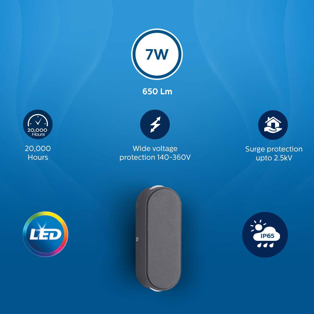 Its elegant up-down (2-way) beam effect washes the wall with soft warm light, creating a premium look while improving nighttime visibility.